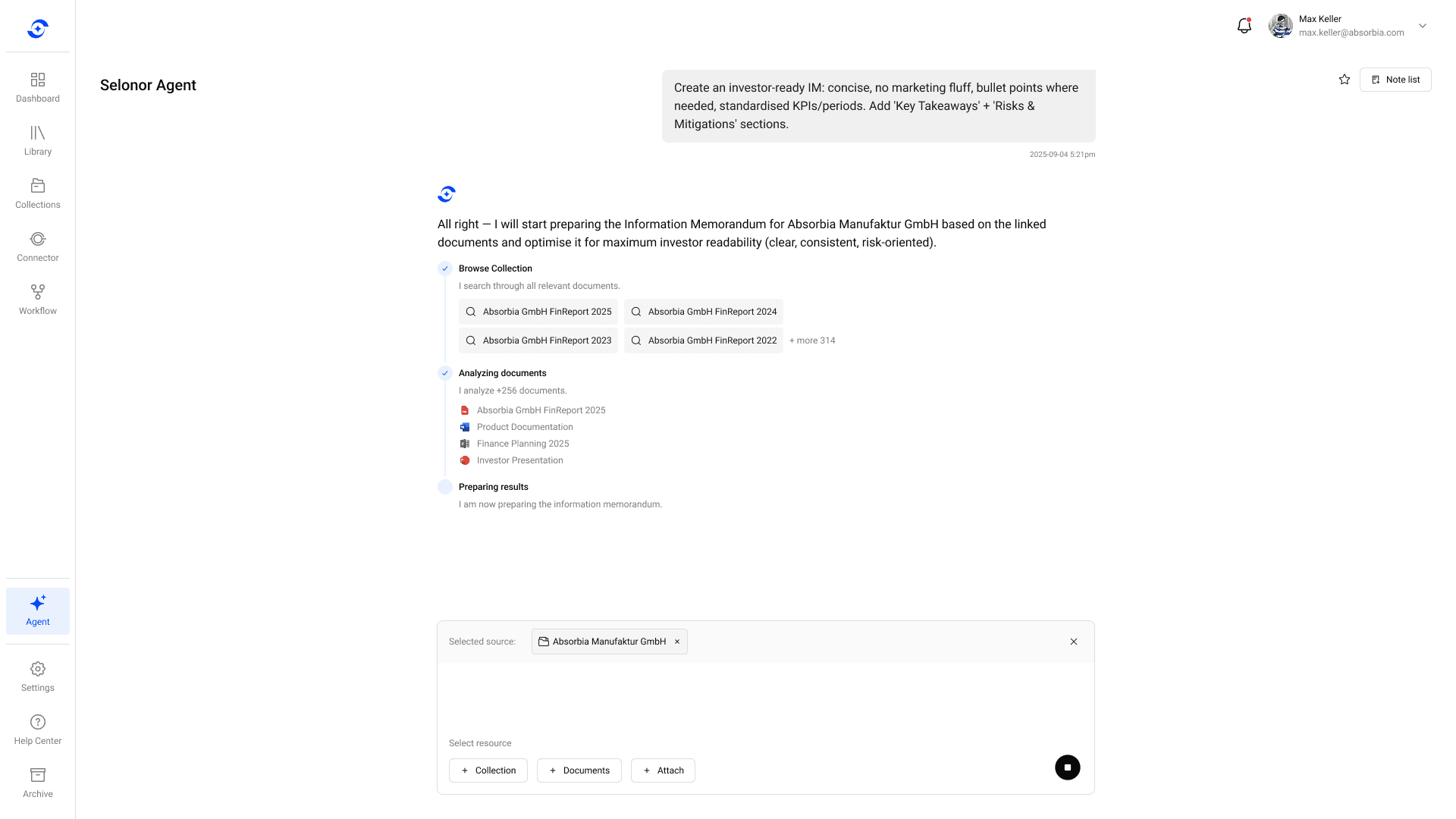 Selonor streamlines everything from answering due diligence questionnaires to drafting investment memos — helping investment professionals spend less time managing documents, and more time closing deals.